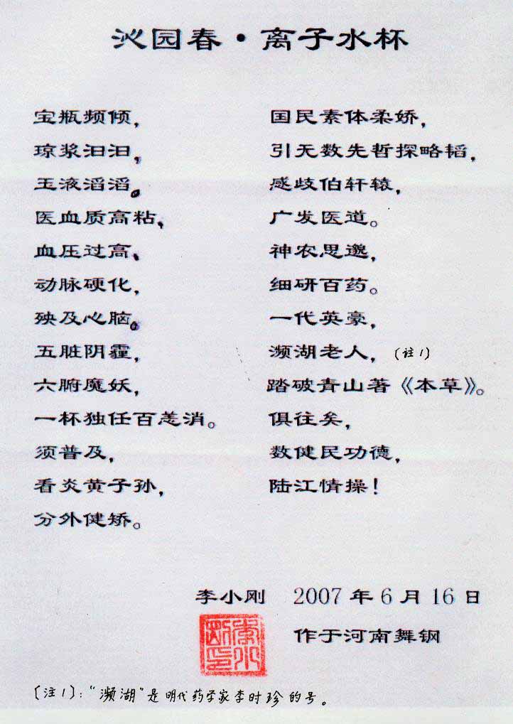 一.發明的亮點是中國基礎醫學研究成果的轉化醫學應用------------------------------------------------------------------------------------ 1990年春,我50歲,發現患了高血壓,便及時遵醫囑服藥。我想起父輩、祖輩曾患高血壓,后來都患中風癱瘓或心梗過世,所以心中壓力大。我夢想能根治高血壓,便研究醫學。當我檢索到中國基礎醫學研究成果,采用高脂餐和磁處理小分子團水飼喂小白鼠或大白免等兩組哺乳動物,經過2、4、6個月剖殺血檢,發現飼喂小分子團水的試驗組動脈內壁干凈,能減輕和延緩動脈粥樣硬化。我從這些研究成果受到啟發。覺得有責任研制出優良的器具,讓天下人能真正治愈高血壓,消除動脈粥樣硬化,延年益壽。于是,1990年我做成樣品,先后與愛人飲用兩三個月,分別治愈了高、低血壓,之后我們的血壓都正常,癥狀消失。該水經南京大學做核磁共振檢測為55.82赫茲的微小分子團水。該品經工業開發后,1994年送給廣西三家三甲醫院做臨床試用4個月,再經北京和廣西醫學專家鑒定認為:“降脂降壓效果好” ,“能擴大心腦動脈流量,改善心腦電圖和微循環” ,“對治療心腦動脈粥樣硬化、高血壓、高血脂有良好的醫療保健作用”。1996年產品獲得中國發明專利權。這就使產品可以轉化為醫學應用,人類可逐漸改變終生服藥,自己祛除病癥。